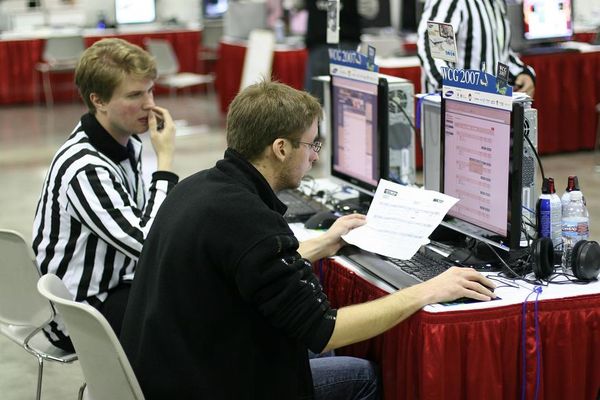 Наконец, игроков впустили в зону NFS, началась посадка за компьютеры и тут у меня, как и у других NFS’еров, играющих на рулях, появилась очень сложная проблема – руль невозможно было зафиксировать, т.к. столы были слишком толстые! Большое спасибо предусмотрительному латвийскому гонщику - USSRxAlexio, который выручил меня, вручив двусторонний скотч. Потратив уйму времени на фиксацию руля, я тут же приступил к настройке автомобилей, успев сделать лишь по одному заезду на каждой трассе. И вот главный судья объявил о начале первого раунда группового этапа (второй год подряд главным судьей по NFS’у является представитель Румынии, вторым судьей был американец (не раз судивший турниры серии CPL), который, помимо исполнения своих судейских обязанностей, помогал игрокам при возникновении любых технических вопросов, связанных с компьютером или непосредственно с игрой), WCG началось…