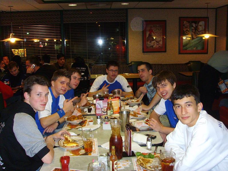 Забросив вещи, я отправился с Виртусами на поиски пищи, т.к. мы изрядно проголодались. Но поиски наши длились недолго – прямо напротив нашего отеля, на другой стороне дороги находился прекрасный «фаст-фуд-ресторан», называемый “Denny’s” (это целая сеть ресторанов быстрого питания), в котором мы с удовольствием питались на протяжении всех дней нашего пребывания (я и представить не мог, что бывает такой качественный фаст-фуд). Поначалу мы никак не могли привыкнуть к огромным порциям еды, но уже через пару дней стали питаться по объему как среднестатистический американец, набирая килограмм за килограммом :)